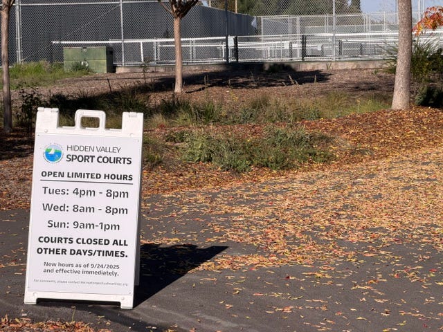 A sign alerts players to new limited hours for play at the Hidden Valley Sport Courts.